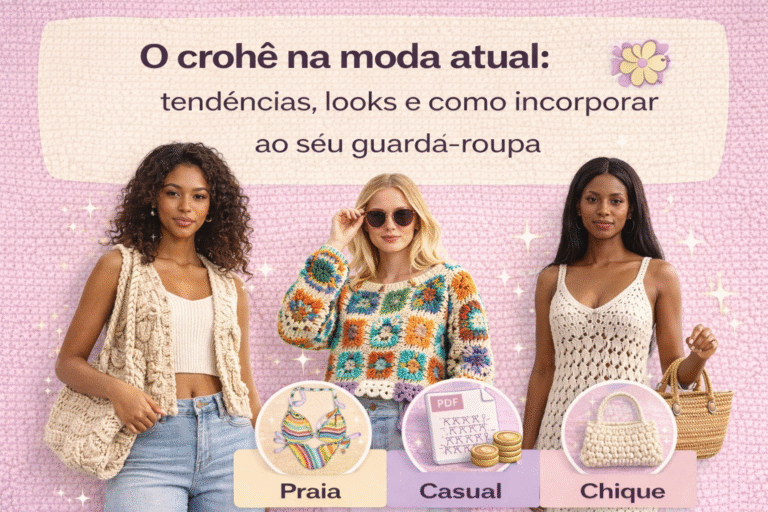 Conclusão: O crochê na moda atual é muito mais que uma tendência passageira: é uma convergência entre nostalgia, sustentabilidade e criatividade técnica. Seja como peça central do look ou como detalhe textural, o crochê permite versatilidade e personalidade. Para quem produz, há oportunidades reais de mercado — desde nichos artesanais até colaborações com marcas—, e para quem usa, o crochê oferece formas elegantes e conscientes de expressão pessoal.